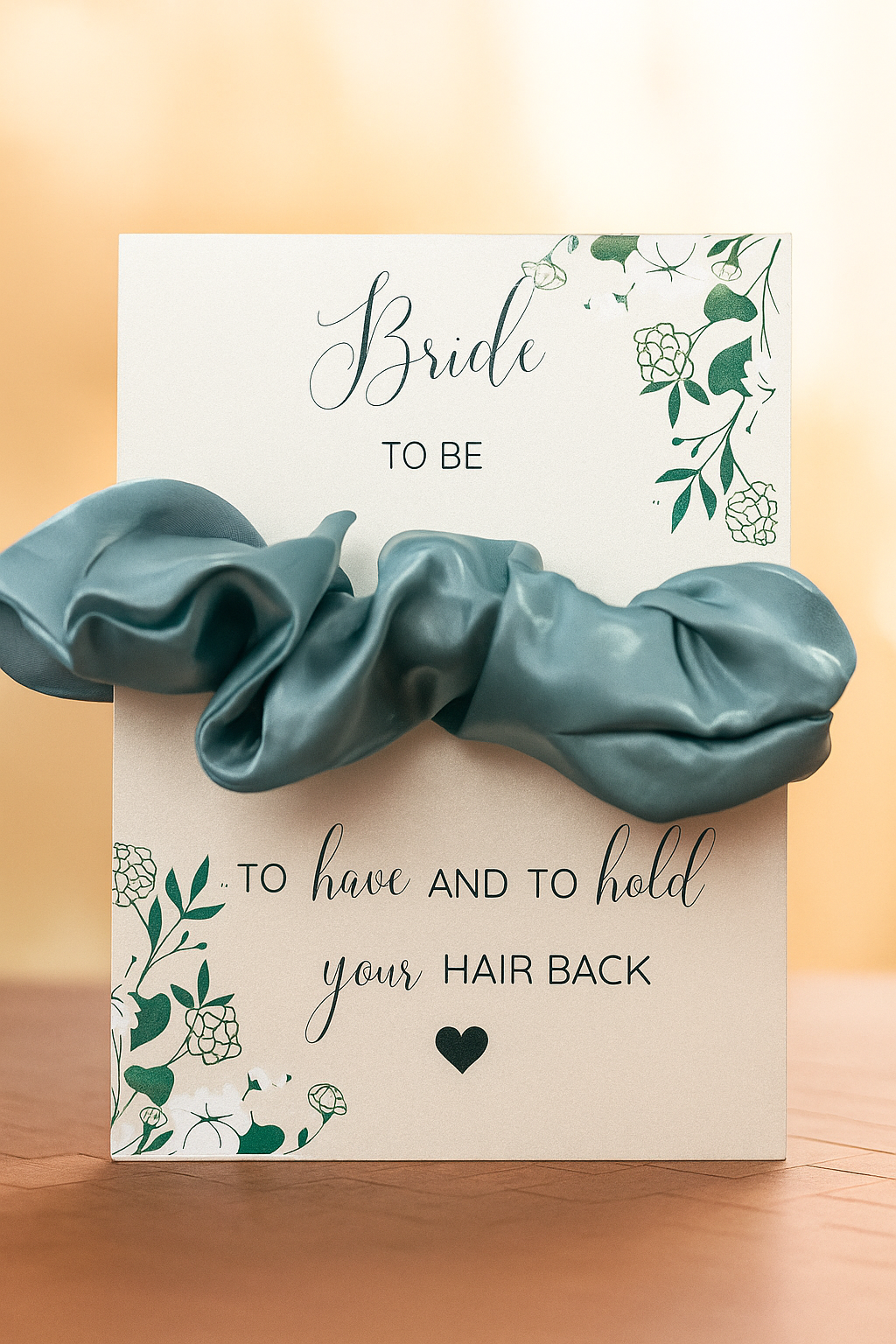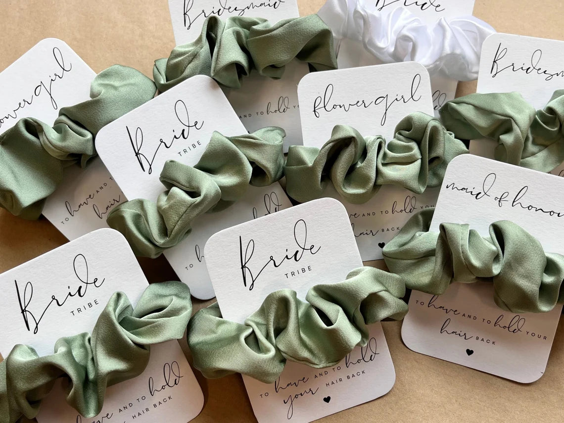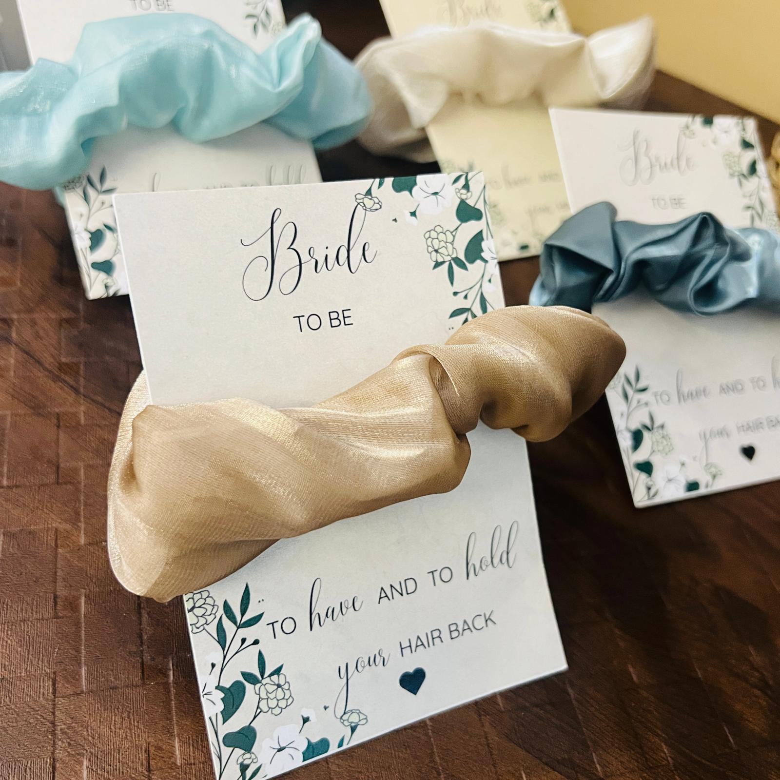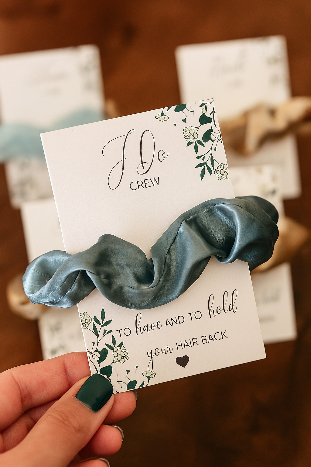 Add a charming and practical touch to your bridal party gifts with these elegant satin scrunchies, beautifully presented on floral cards featuring sweet messages like "I Do Crew" and "Bride to Be."