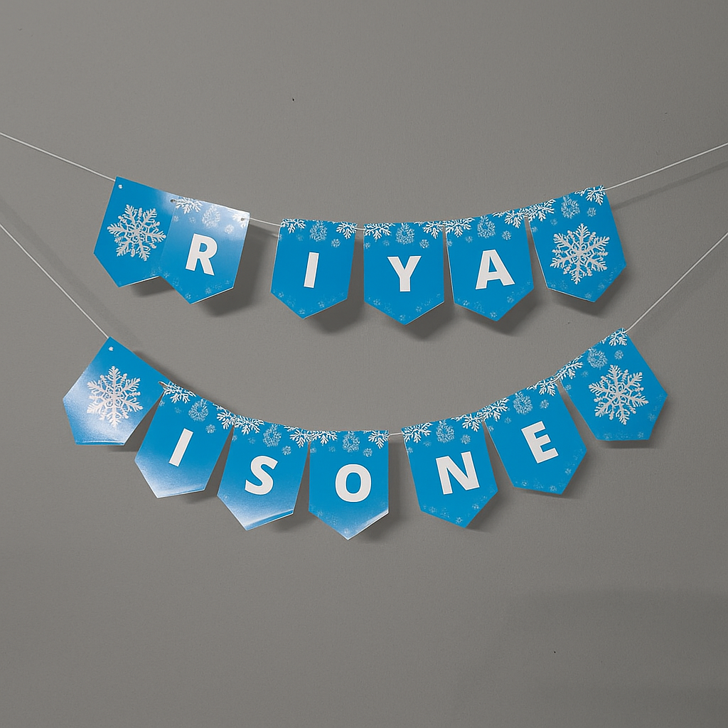 Celebrate your little one's first birthday in style with our charming "RIYA IS ONE" winter-themed birthday banner! Featuring bold white letters on vibrant blue pennants adorned with delicate snowflakes, this banner adds a festive and elegant touch to any party setting.