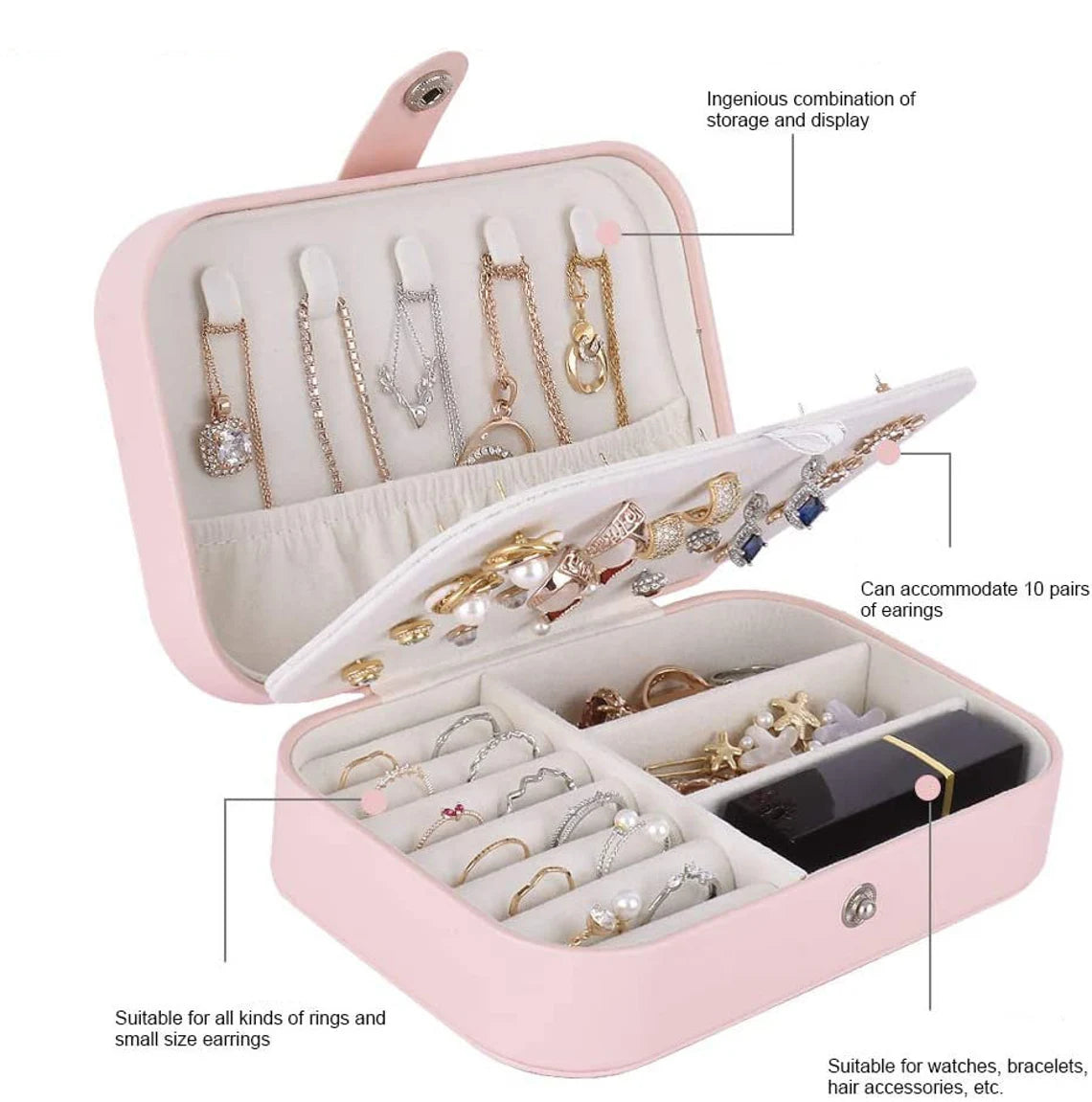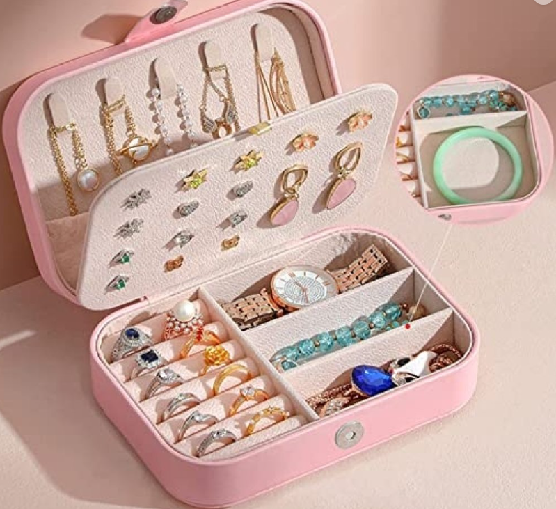 Soft lined interior with compartments for rings, earrings, and chains