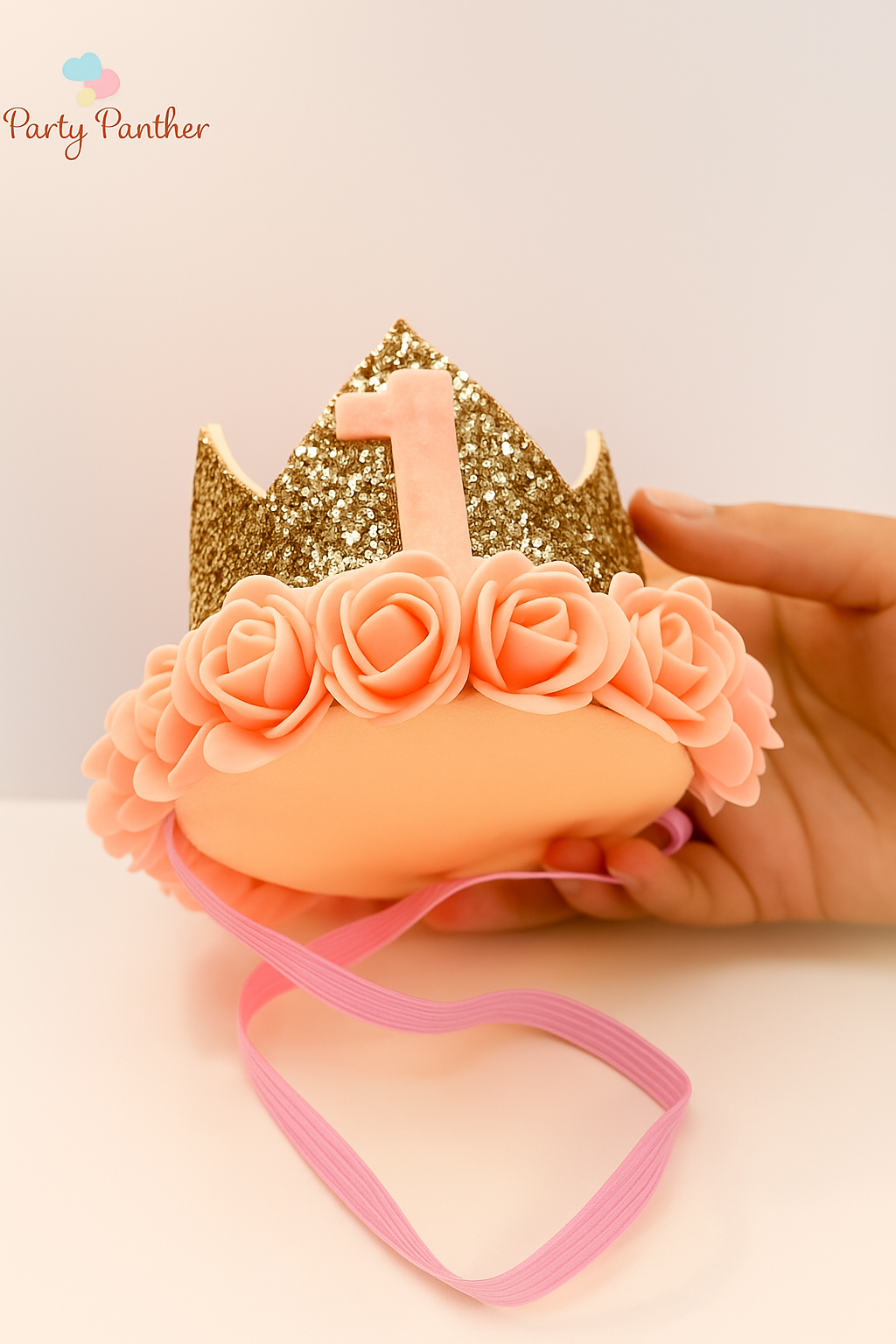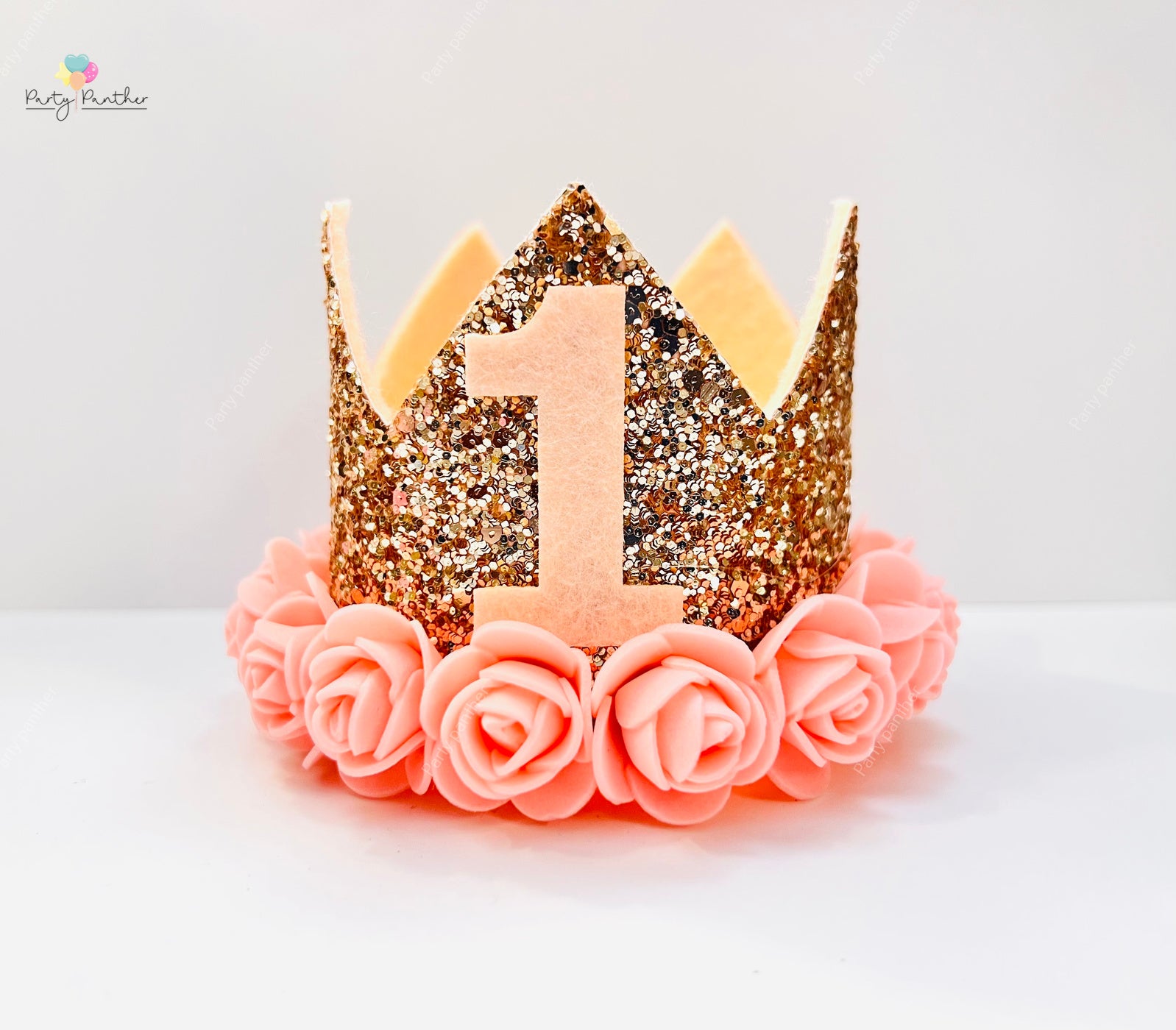 Make your baby girl's first birthday truly magical with this stunning pink and gold glitter crown from Party Panther! Designed to capture the essence of a princess celebration, this lightweight and comfortable tiara is adorned with soft blush pink foam roses and shimmering gold sequins. The bold "1" at the center makes it the perfect accessory for cake smash sessions, photo shoots, or birthday parties.